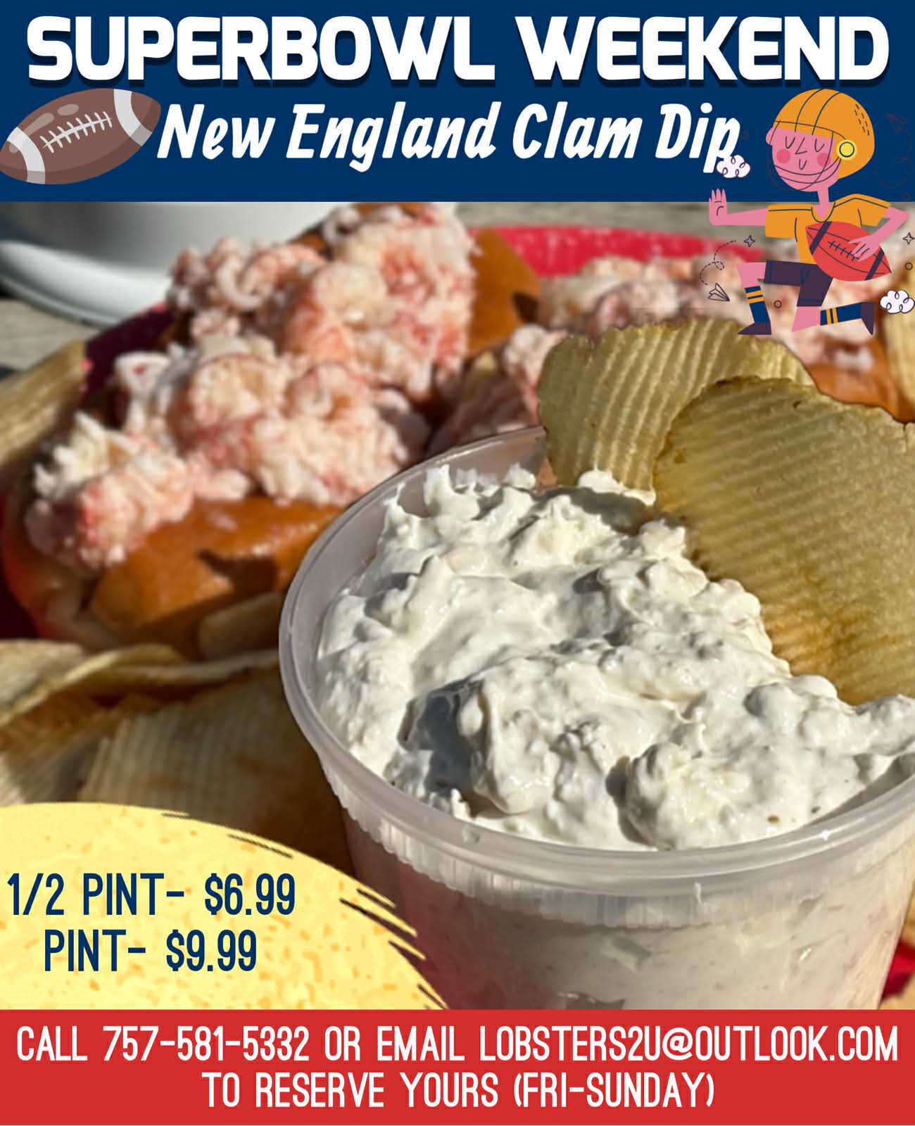 CALL WAYNE AT 757-581-5332 BY THIS THURSDAY @9PM TO RESERVE YOUR FRESH SEAFOOD. YOU CAN ALSO EMAIL US AT LOBSTERS2U@OUTLOOK.COM