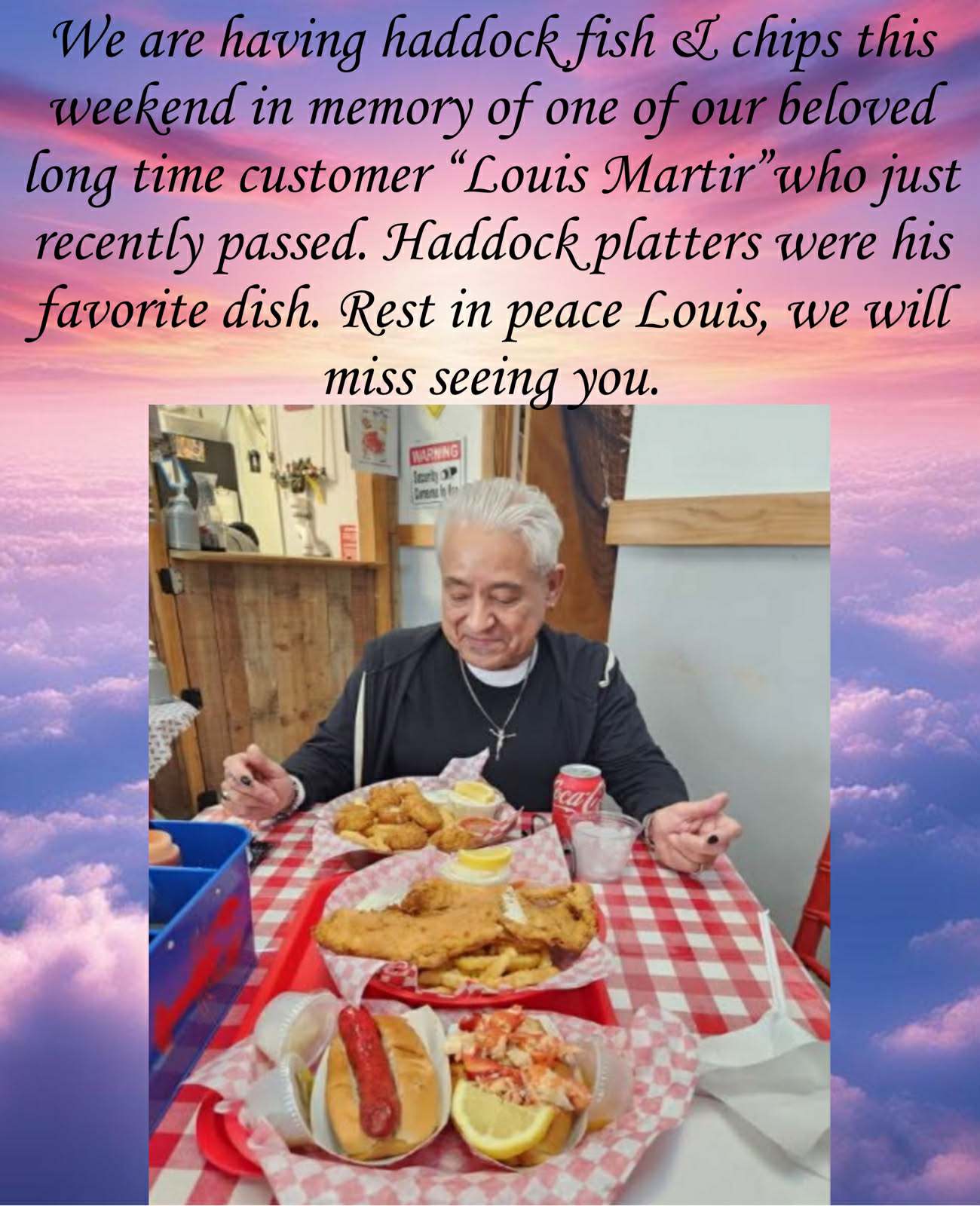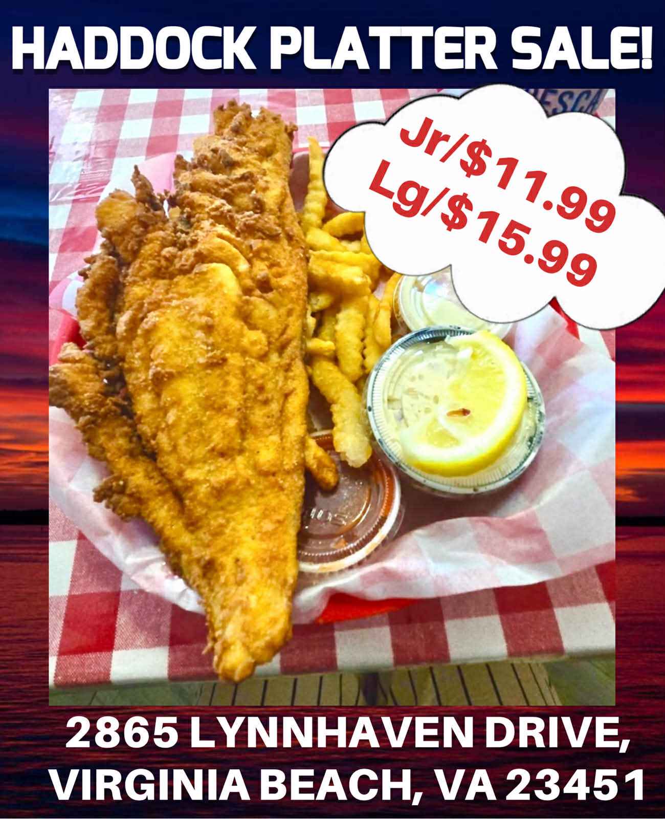 A huge portion of fried Maine haddock, crinkle cut french fries, slaw, lemon wedge and your choice
