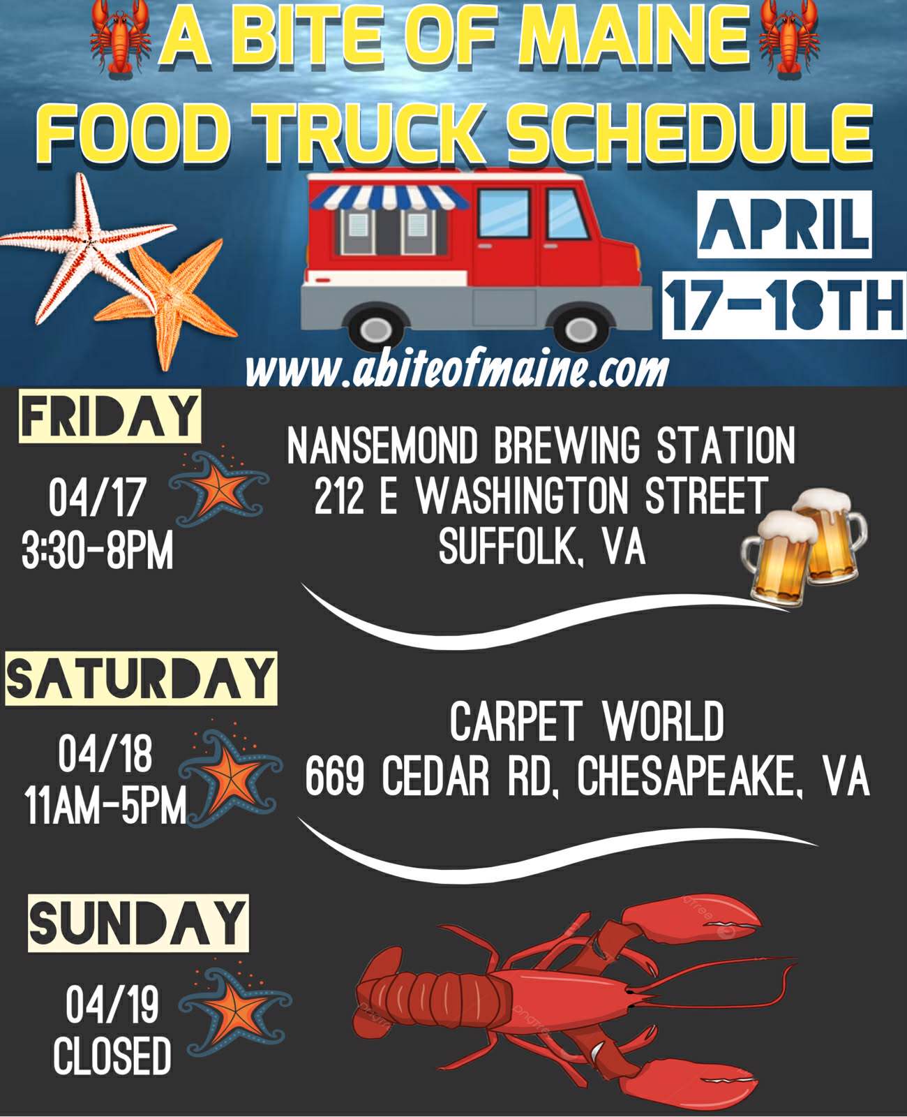 CALL WAYNE AT 757-581-5332 BY THIS THURSDAY @9PM TO RESERVE YOUR FRESH SEAFOOD. YOU CAN ALSO EMAIL US AT LOBSTERS2U@OUTLOOK.COM