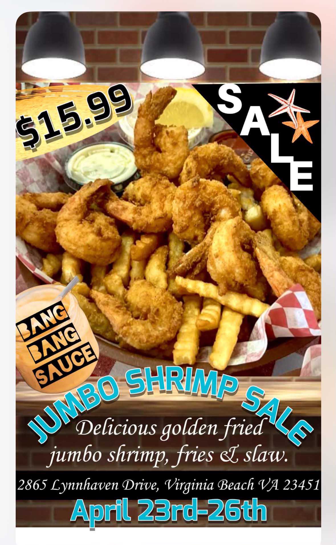 Get a loaded platter with golden fried jumbo shrimp, fries, slaw, lemon wedge, bang bang sauce and choice of cocktail or tartar.