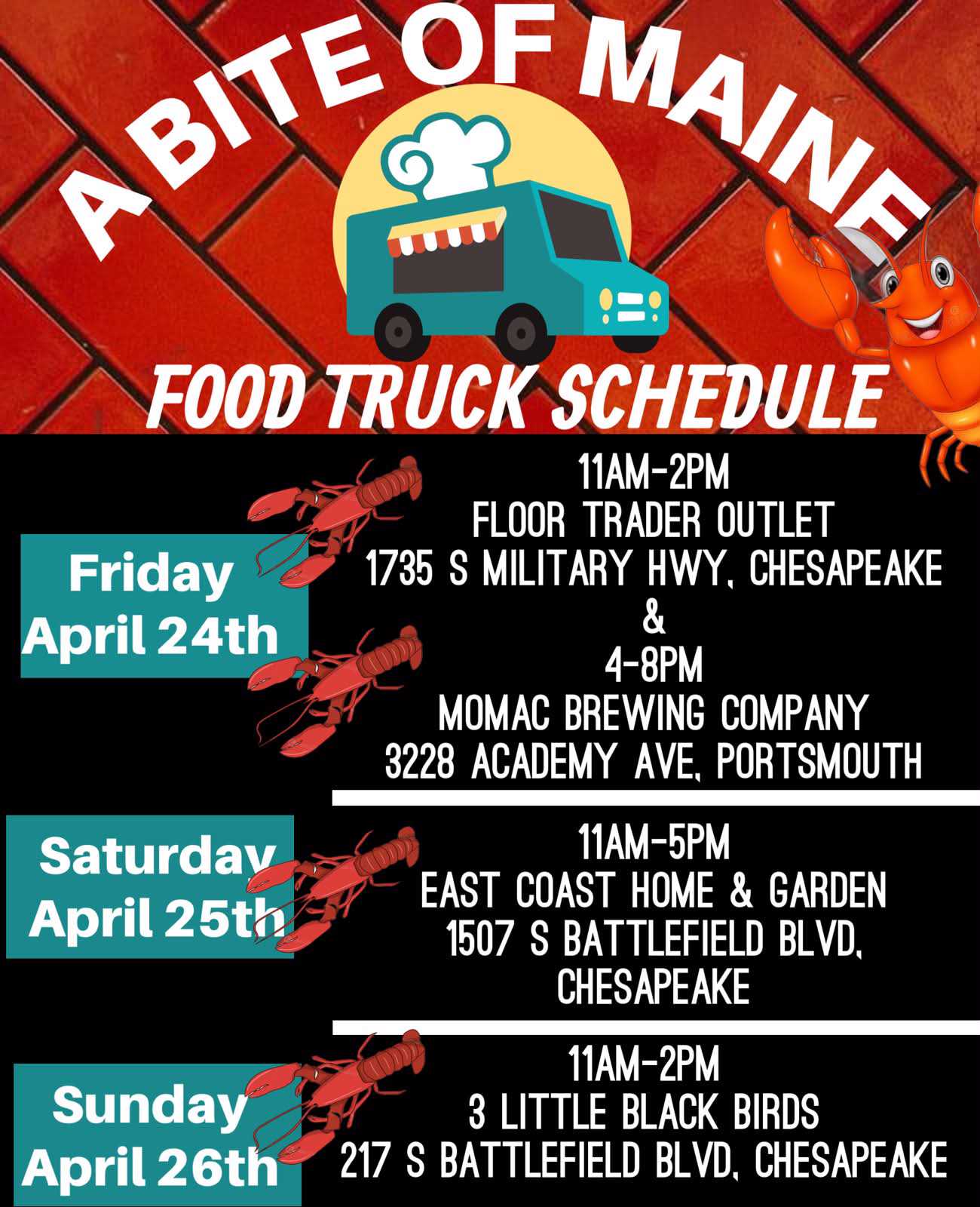 CALL WAYNE AT 757-581-5332 BY THIS THURSDAY @9PM TO RESERVE YOUR FRESH SEAFOOD. YOU CAN ALSO EMAIL US AT LOBSTERS2U@OUTLOOK.COM